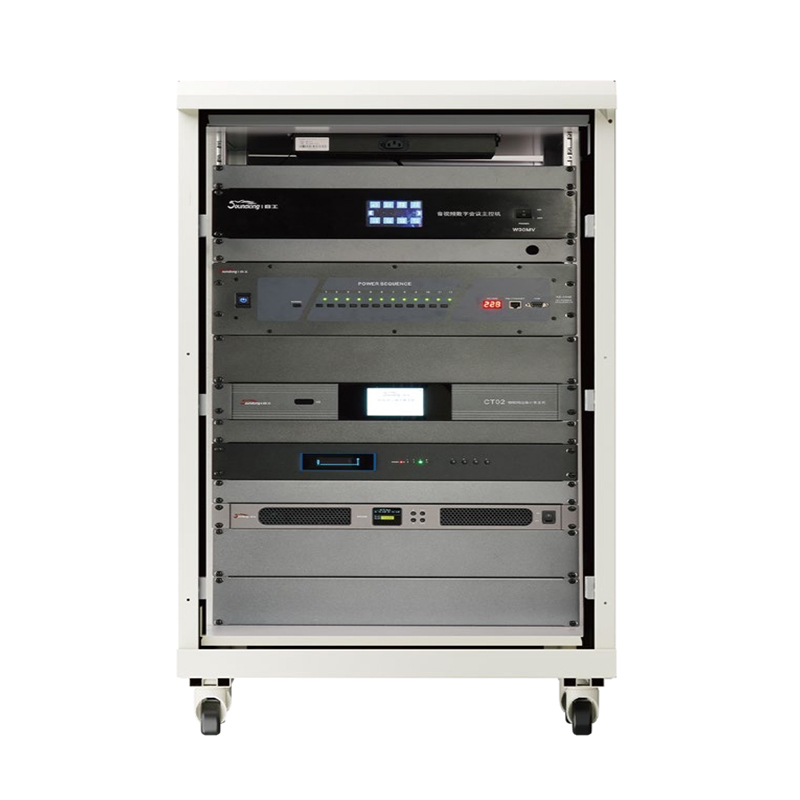 该AI会议系统是音王科技创新成果的综合应用的高附加值产品。系统内置有:国际先进的自适应调音器、声音反馈抑制器和高性能会议话筒、物联中控系统、会议专用多指向同轴音箱等。自适应调音器提供增益共享技术,可以消除会议噪音,减少反馈混响,减少相邻麦克风之间的干扰,自动调整输出电平。反馈抑制器提供的反馈抑制(AFC)功能,噪声抑制(ANR)功能和自动均衡(AEQ)功能,使麦克风的增益表现更加优秀。同时系统中还加入中控面板控制设备,颠覆了传统会议系统有专人音控师在现场操作的模式。只要第一次安装调试完成,就能实现一键开关机,无需专人现场操控。所有设备安装在定制机柜中,大大简化了安装、调试的工作时间。