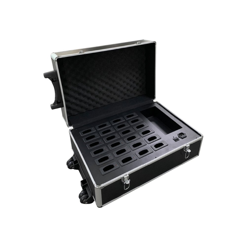 采用AC 110V–220V交流供电,可同时为24只接收单元充电。配备伸缩拉杆与滑轮,便于移动和管理。具备充电保护与状态指示功能,确保设备安全高效充电。