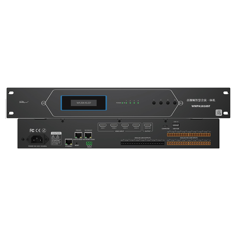 WMPA1616ST音视频智慧会议一体机支持16路模拟输入和8路模拟输出,确保高品质音频传输和处理;还包括4x1HDMI+1路Type-C无缝视频切换,提供清晰流畅的视频画面;同时支持AES67数字协议,可做高效和低延时的数字传输