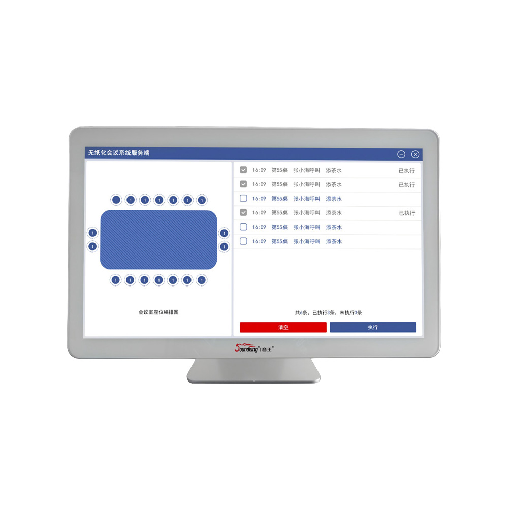 采用全铝镁合金外壳及铝镁合金底座,显示屏高清亮丽,10点触摸,主要装载电子桌牌系统服务软件,编辑发布显示会议主题、与会人姓名、职位等信息,完成单位团体内部开会人员信息的录入与显示批量导入;会议室坐席排位、统计视频签到、接受参会人员在会议现场进行呼叫服务、会议资料推送、发起实时投票选举、问卷调查等。