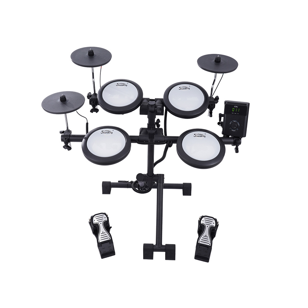 旅行网鼓 SD10M,鼓架采用音王专利的折叠支架,镲片采用两次注塑工艺制作而成,经久耐用。军鼓及嗵 鼓全部采用网皮鼓尺寸为7寸,所有都为单声道。镲片采用全包胶,胶皮表面,尺寸为8寸, 全部为单通道。鼓盘和钹镲调节部位采用S形旋钮调节,收纳方便。连接管采用独家专利的装配方式,可完美隐藏线材做到外观简洁。