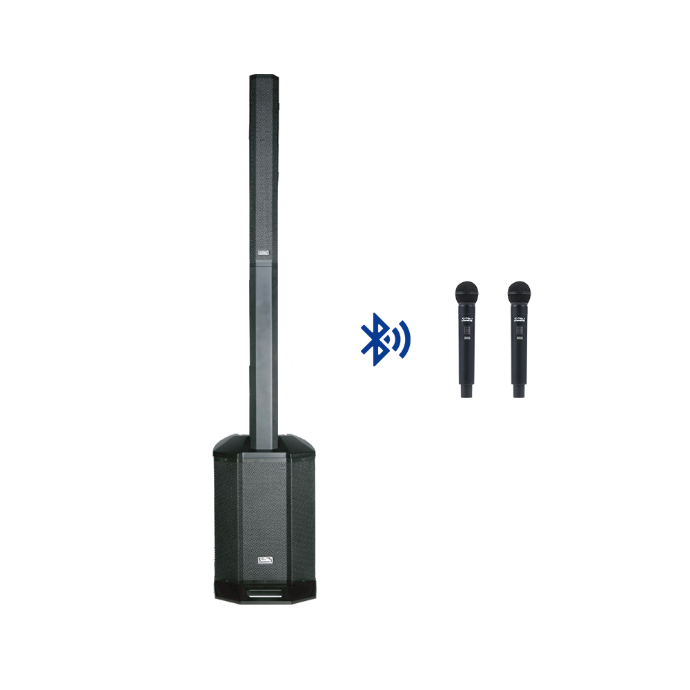 无线麦克风组合音响,一款由2只无线麦克风+1只6x3寸无源塑壳音柱+1只内嵌4路输入帶双通道功率放大器箱式调音台的有源超低频音箱+1只塑壳音柱支撑箱组成的一套高性能便携式的自带无线麦克风组合音响系统。三分频的塑壳音柱内置,6x3寸全频扬声器+1寸压缩驱动器号角扬声器,其音质出色,重量轻,携带方便,恒指向性高音号角设计,声场覆盖均匀。12寸有源超低频音箱,倒相式设计,内置2x300W双通道功率放大器和4路输入通道的箱式调音台。其中调音台包含2路MIC/LINE输入,1路RCA立体声混合线路输入,1路HI-Z线路输入,1路副箱信号输出和超低频音量控制。