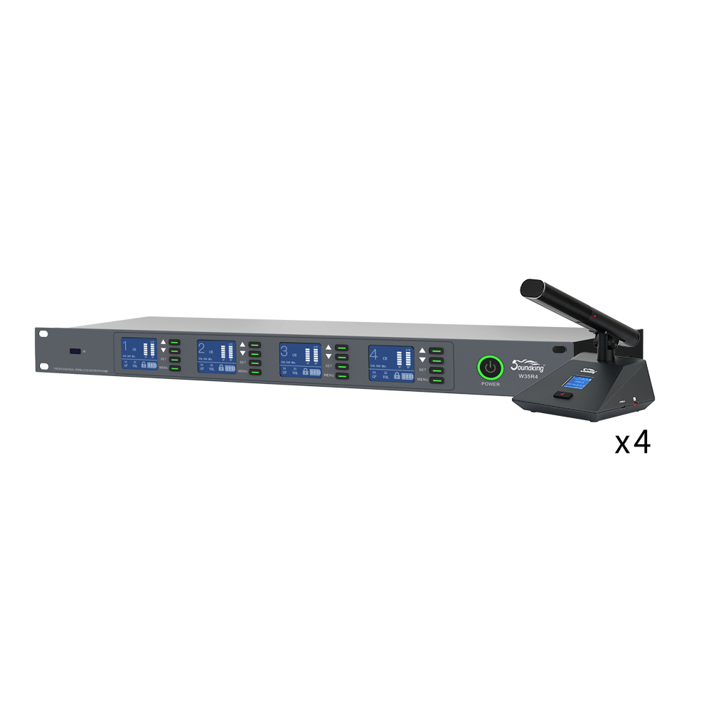 1. 一台四通道无线麦克风收发主机和4台桌面会议式发射器组成的麦克风系统;