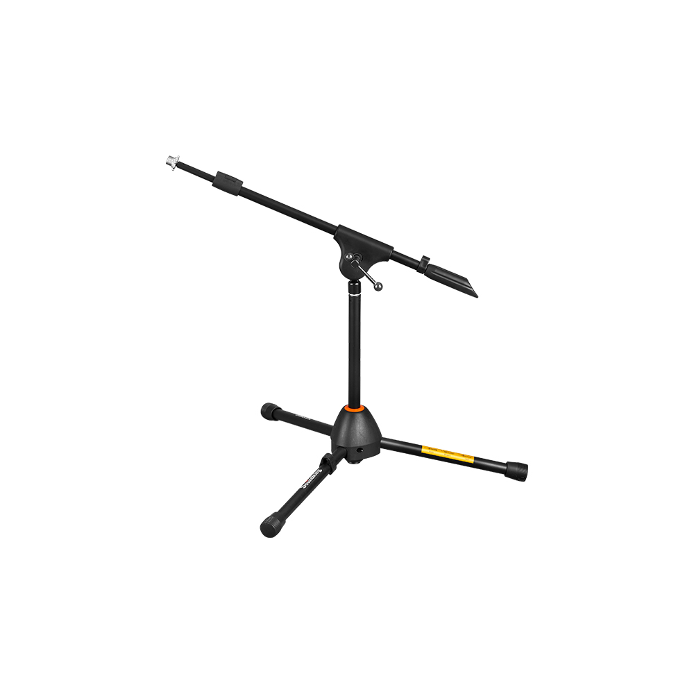 短款麦克风支架,底座部分采用无旋钮方式锁紧,可通过脚管的折叠角度控制将底座锁紧。