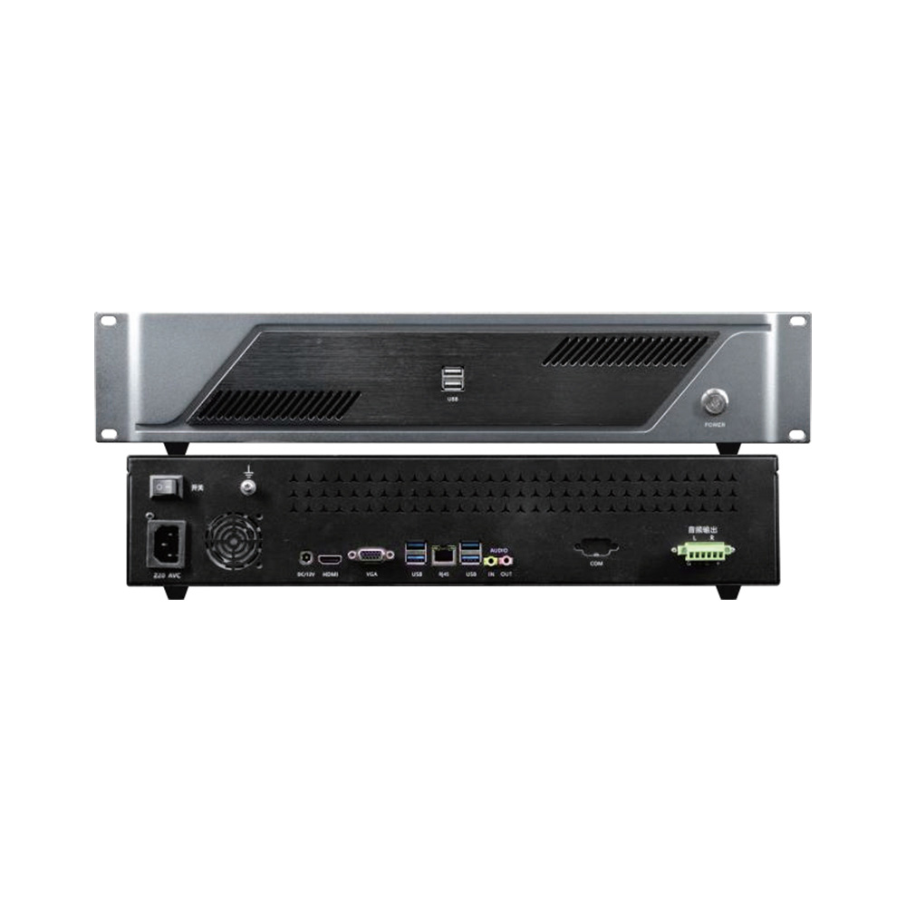 采用全铝合金拉丝工艺,标准19寸机柜式安装设计,外型沉稳大气、细节精致机身却配备高端配置,主要装载无纸化会议投影软件,配合无纸化其他设备实现参会人员可自行将讲稿内容投影到会议室大屏幕,或者有秘书终端管理后再投影;会议秘书还可根据本单位的要求选择宣传片、音乐进行投影播放。