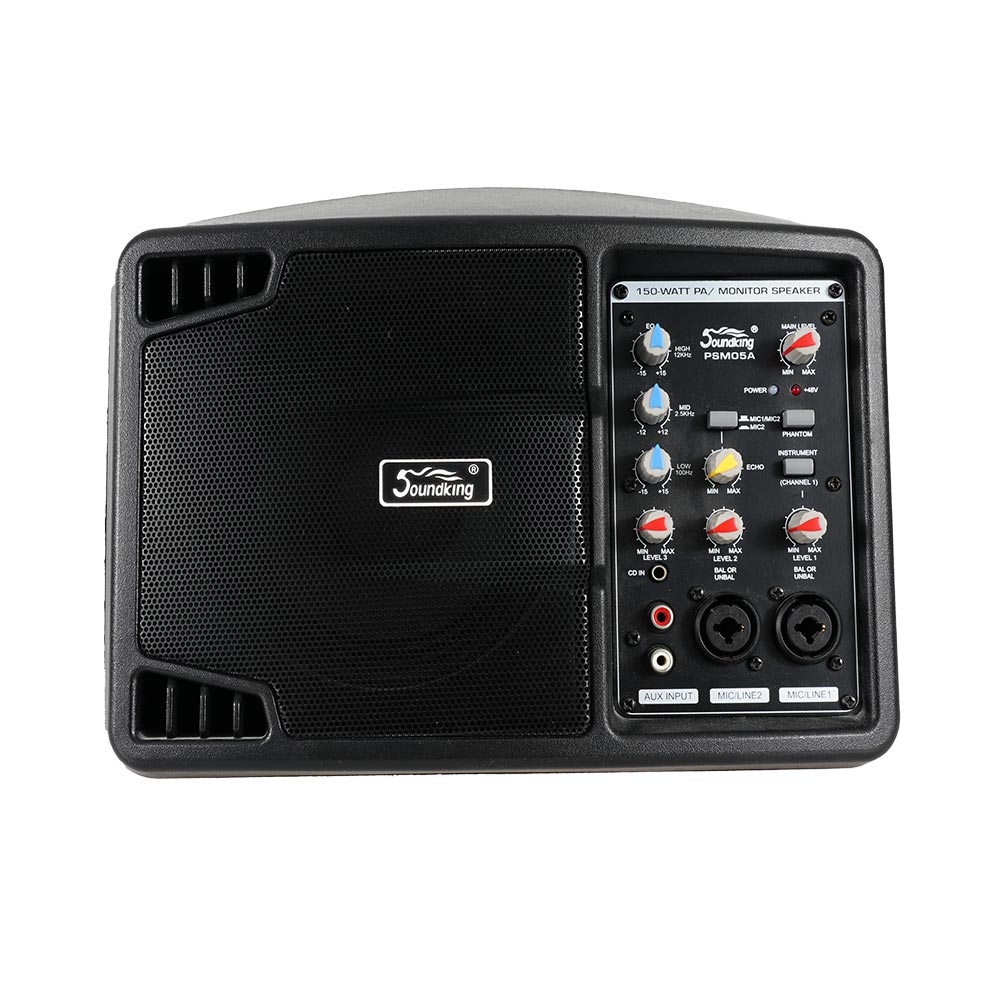 PSM05A监听音箱整体紧奏轻巧,外观设计中配套了安装支架接口和麦克风支架接口,给演出安装机架及放置非常方便,内置有ECHO效果,D类功放150W及高品质的单元喇叭,给演出增加了清脆悦耳的声音效果。MIC1/LINE1通道设计了INSTRUMENT开关,这功能可将吉他输入信号优化更好听,PSMO5A监听音箱配套齐全,具有最全面专业的特性,无论是独奏表演还是全面的中小乐队演出,它都可以满足这些应用的要求。
