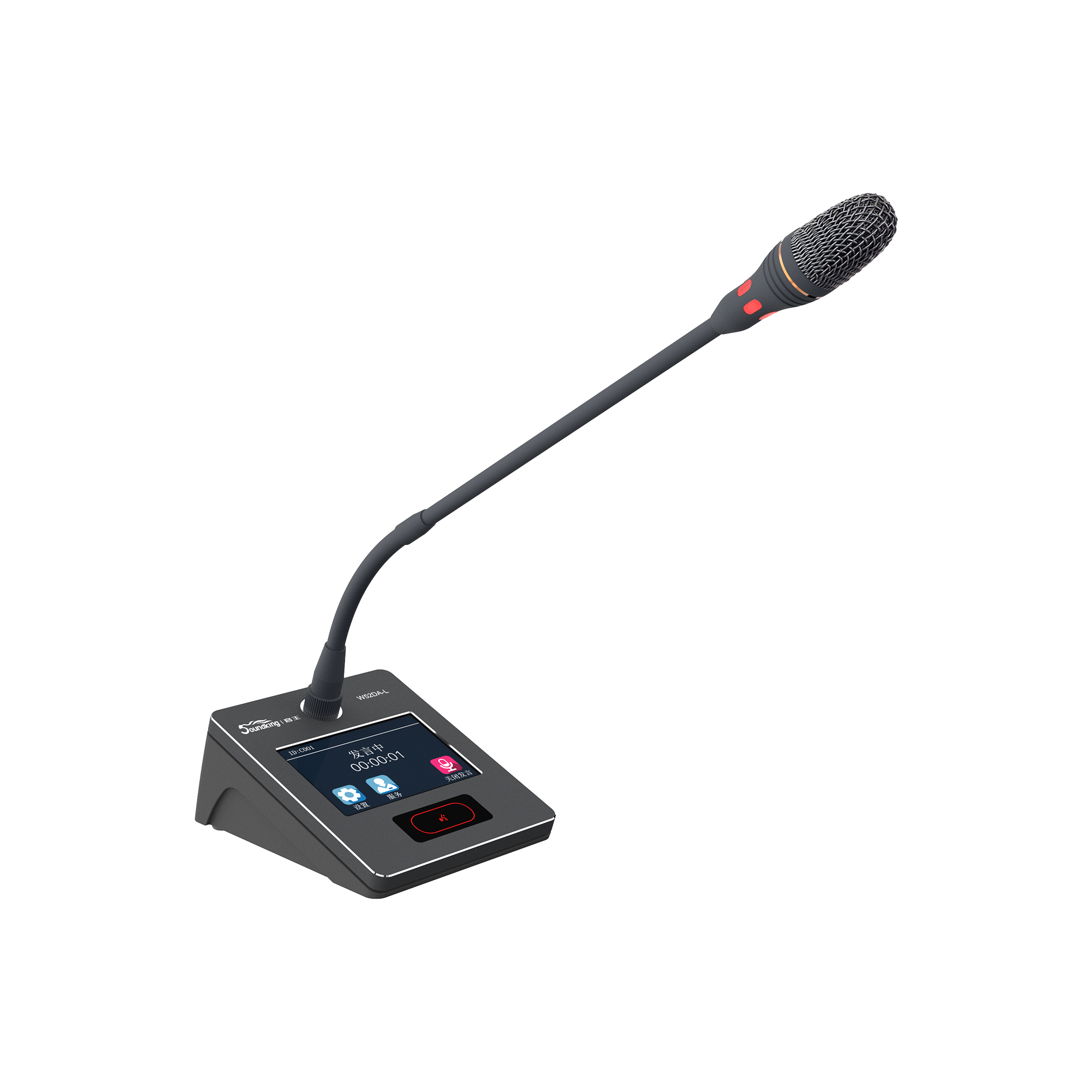 3. 红绿双色雾面指示灯设计,指示发言状态。当红色灯环亮时,表示正在发言,当绿色灯环亮时,表示申请等待发言